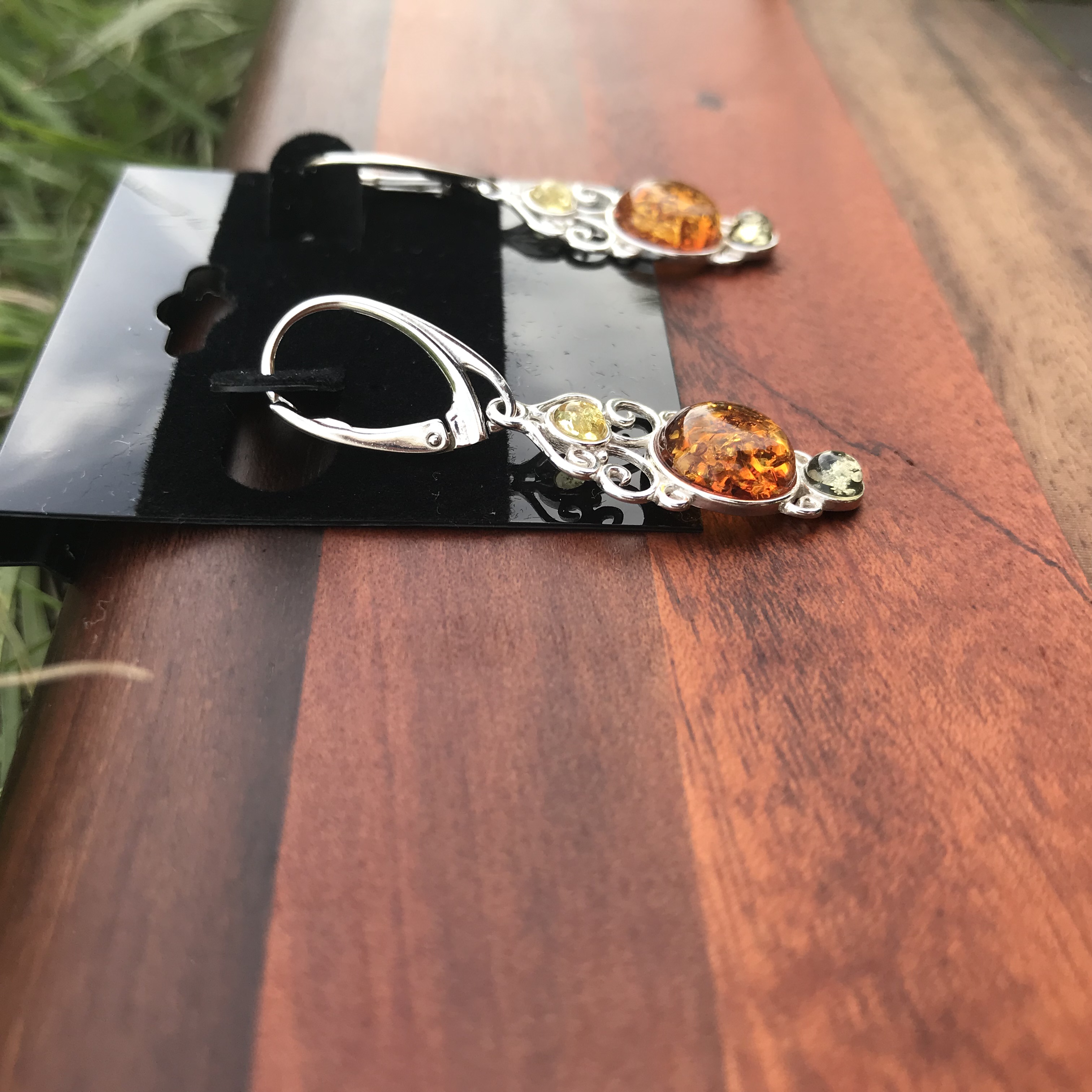 Tri-colored Baltic Amber Earrings w/ Sterling Silver Filigree - Dangly #003