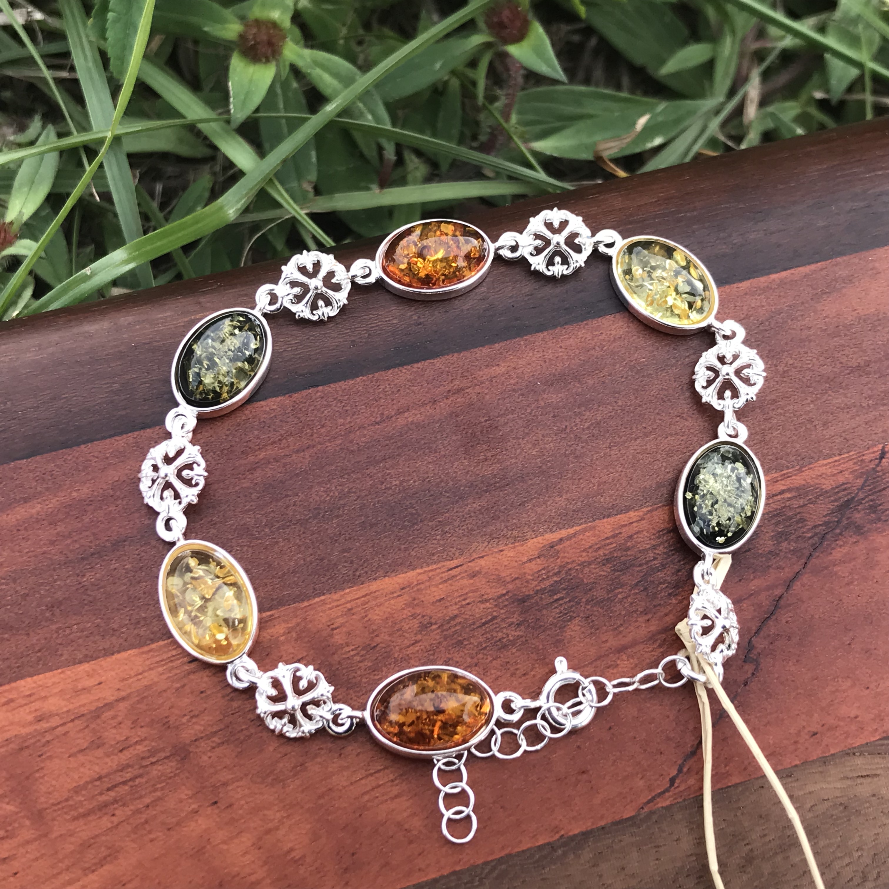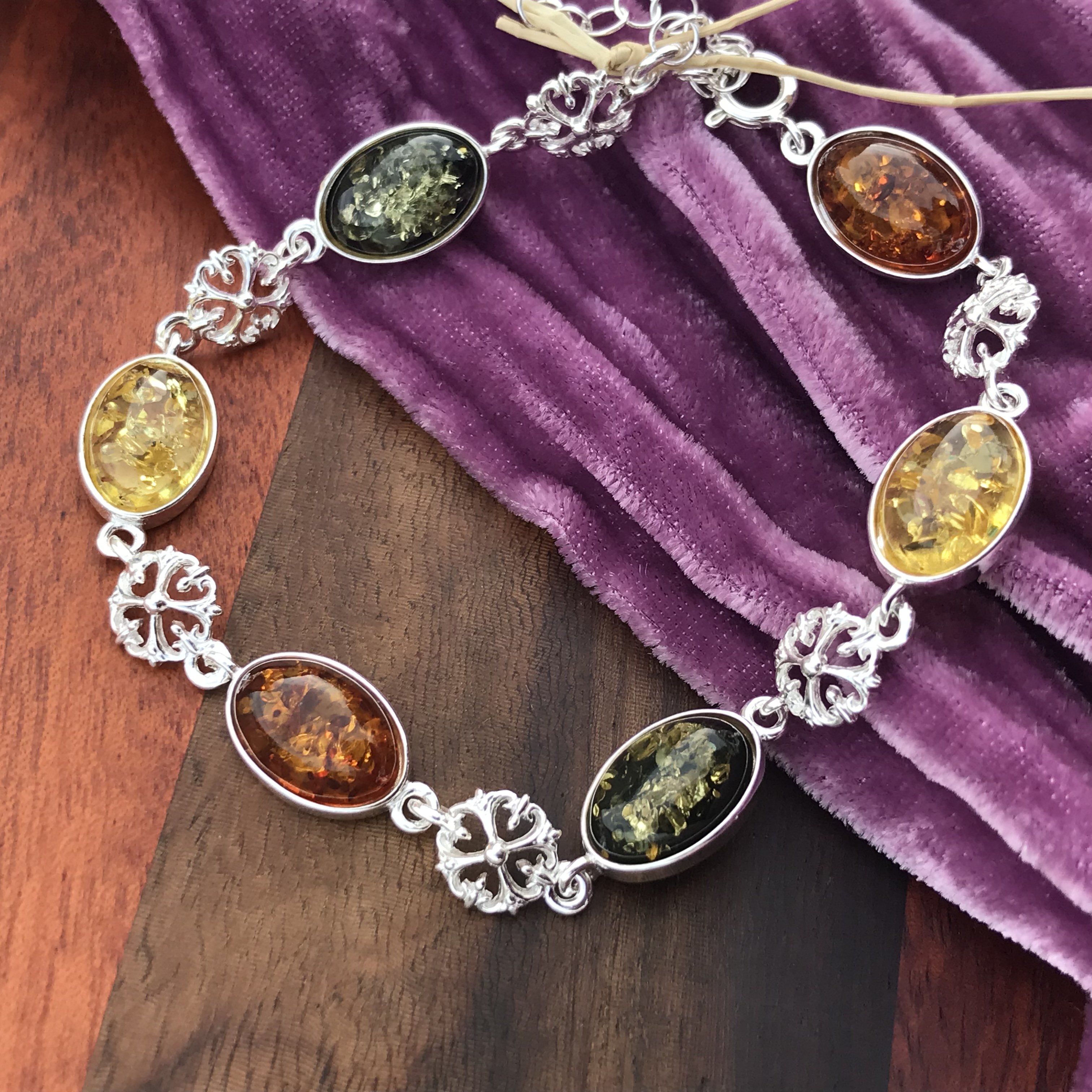 An exquisite succession of amber ovals, rich with inclusion, set in sterling silver. Celtic filigree designs accent the tri-color bracelet. Lightweight. Simply elegant. Versatile. A special, rare, and lasting gift for daughter, wife, mom, or someone else important in your life. This time, why not give her an heirloom?