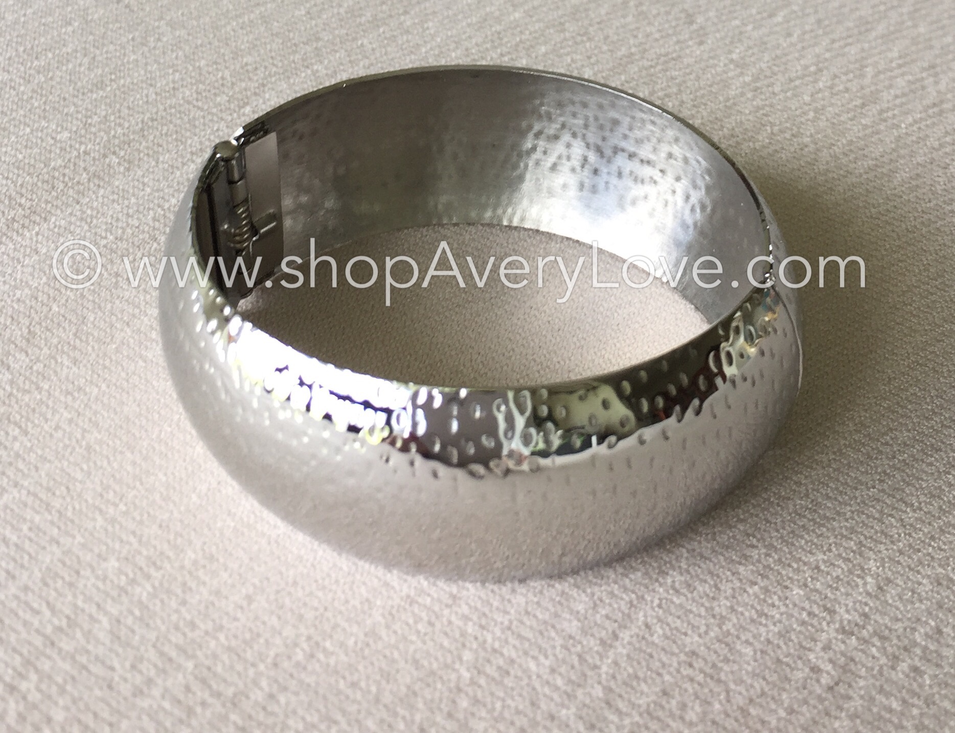 Add a little Boho-chic to your jewelry collection with this hammered, hinged, stainless steel cuff. Easy-on, easy off. One size fits most.