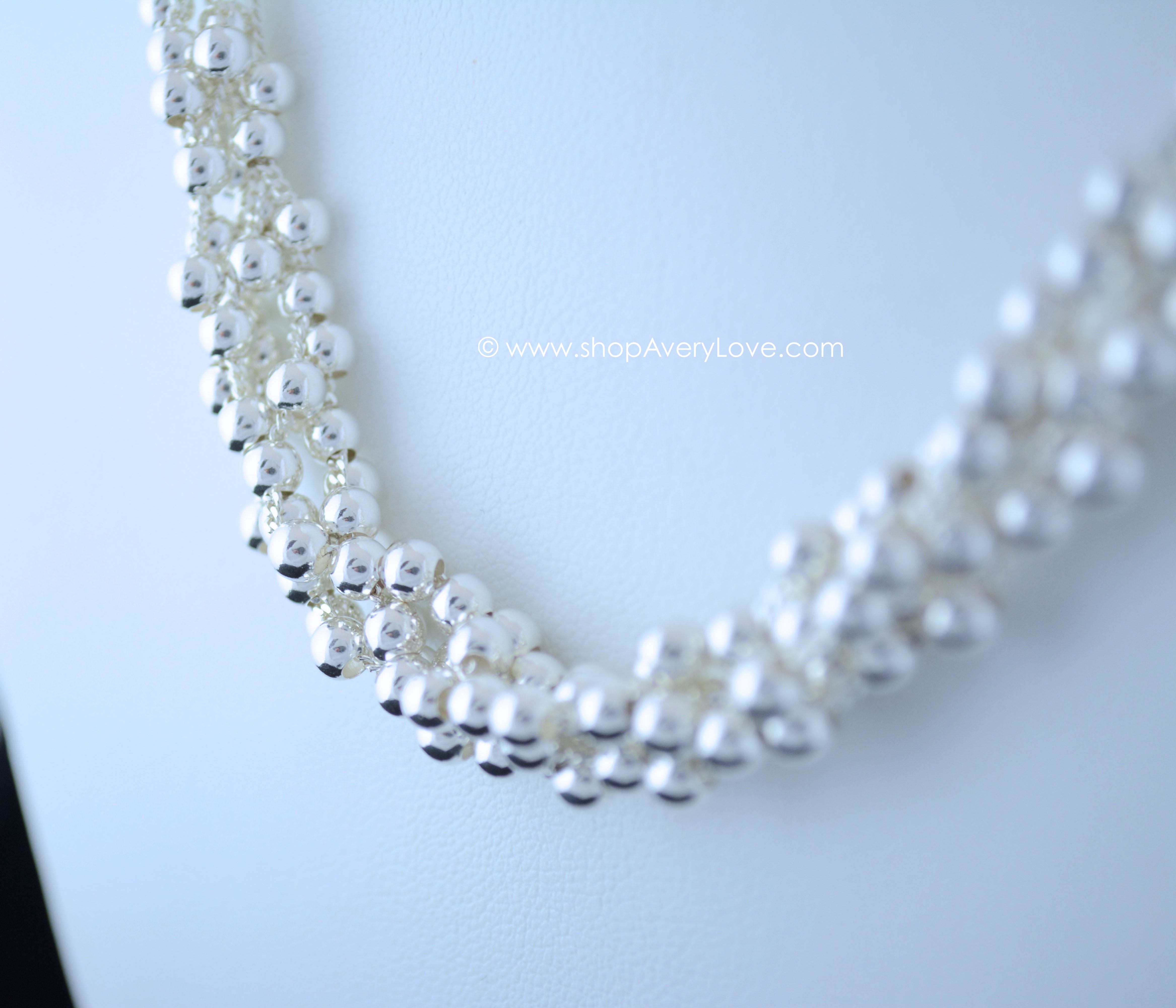 This gorgeous, asymmetrical beaded necklace is a show-stopper -- shiny, silver beads strung in braided clusters. With matching earrings, and bracelet this set will leave the love of your life breathless. Made from 925 Sterling Silver, it's the perfect heirloom gift. Give her something that will last for many lifetimes to come.