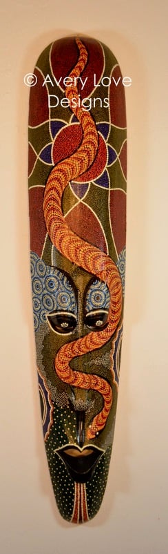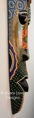 This breathtaking, genuine Indonesian mask is hand-crafted first by carving, then a syringe is used to painstakingly place tiny droplets of paint in a pattern on the mask. Each droplet creates a raised bump of incredible color and texture.